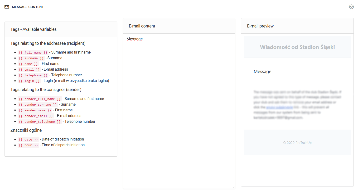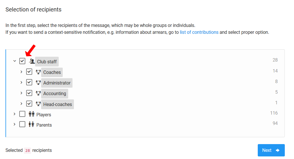 Όπως μπορείτε να δείτε, όταν δημιουργείτε μια καμπάνια από το μηδέν, έχετε την ευκαιρία να επιλέξετε με μεγαλύτερη ακρίβεια τους παραλήπτες του μηνύματος. Μπορείτε να προετοιμάσετε καμπάνιες μόνο για το προσωπικό του συλλόγου, τους γονείς, τους παίκτες ή όλους ταυτόχρονα. Στην πραγματικότητα, μπορείτε να προετοιμάσετε μια ενημερωτική καμπάνια με στόχευση που περιορίζεται σε ένα άτομο.